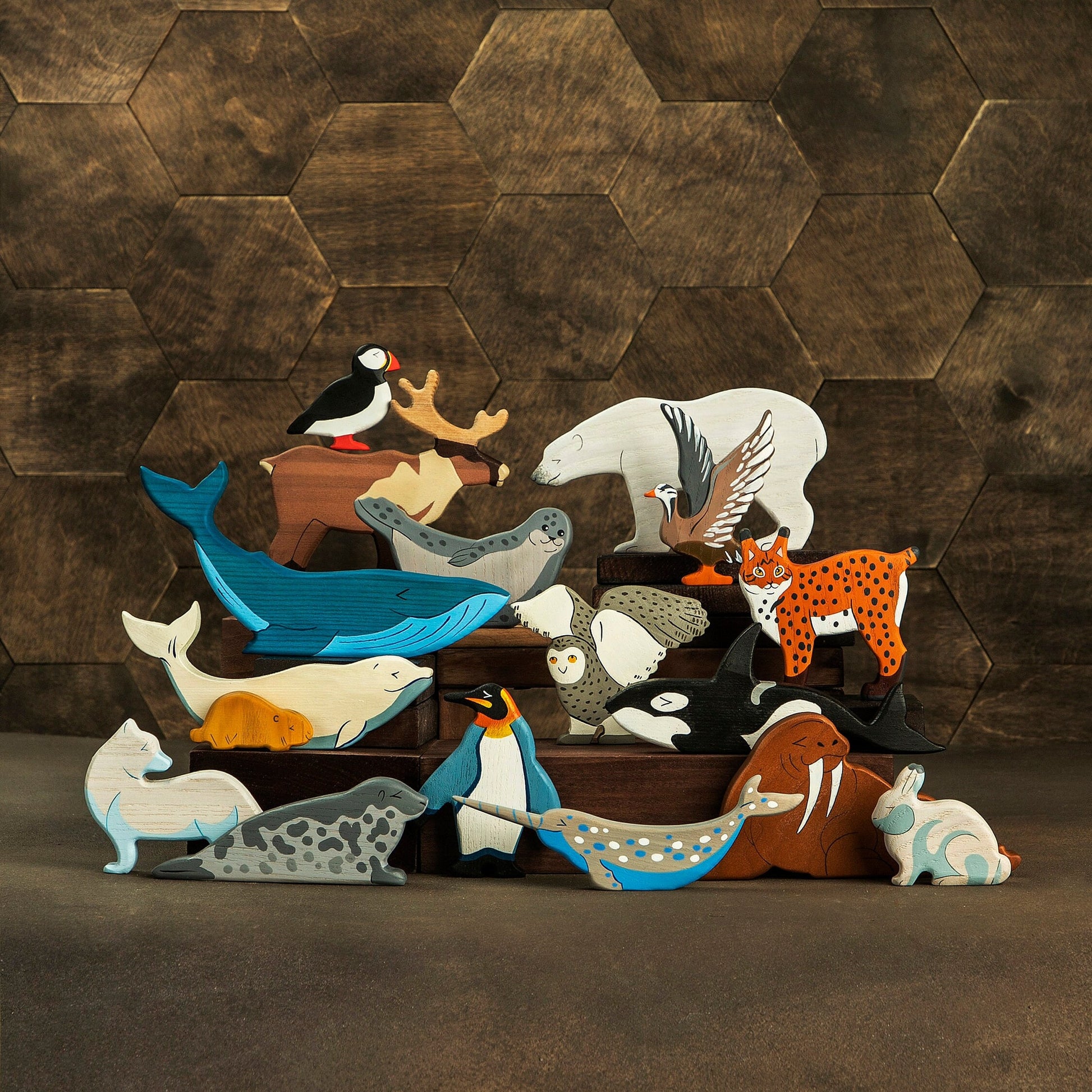 Arctic animal figurines depict rare animals that can be only met in the South and the North Pole. You will hardly have a chance to visit those places in real life. However, it will be a good idea to create a themed natural table using our wooden arctic animal toys. They proved to be very helpful for kids when learning about different animals and plants as well as interact with objects of different shapes and colors.